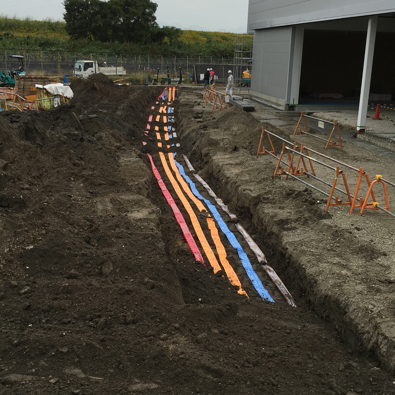 0.8㎥バックホー(自重20㌧)で穴を掘り、高圧電気、低圧電気、電気通信、給水、排水の埋設表示テープが入ったところです。